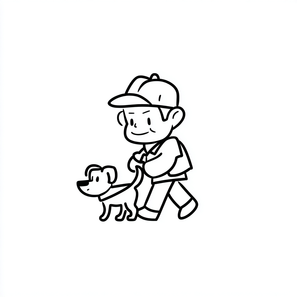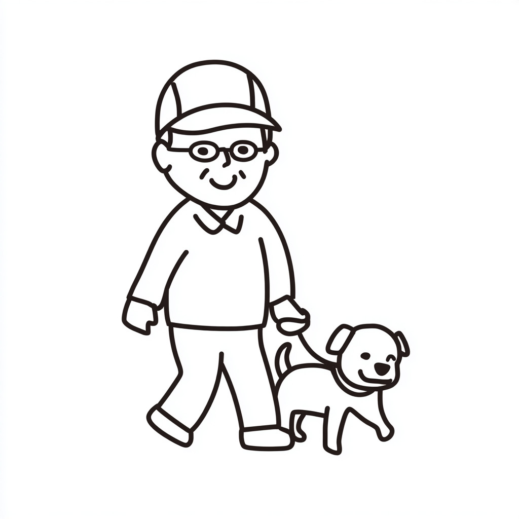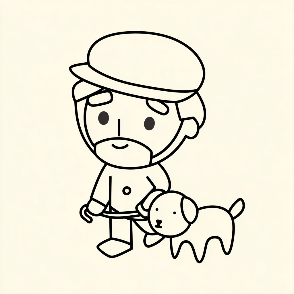 黑白线条艺术印章风格,戴着帽子的老年人牵着一只小拉布拉多犬,设计可爱简约,没有阴影,没有填充,线条粗犷干净,紧凑简单的卡通设计,图标风格插图,适合贴纸或数字印章,柔和温暖的日本插画风格,友好的表情,圆润温和的形状。