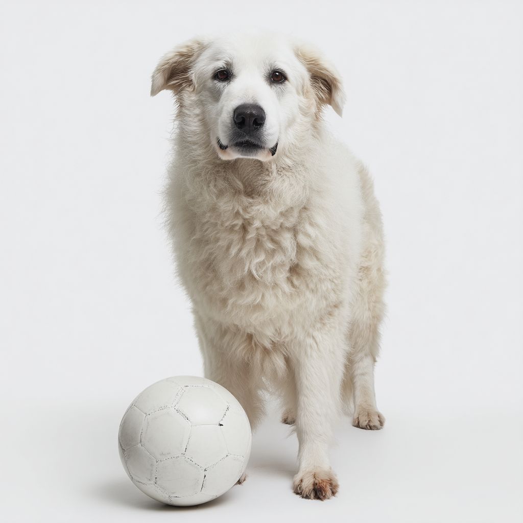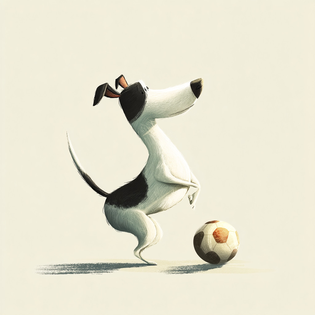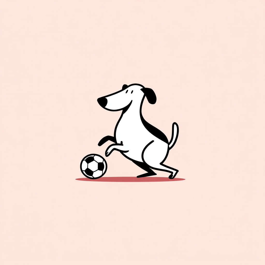 白色背景,简约风格,一只喜欢踢足球的狗。