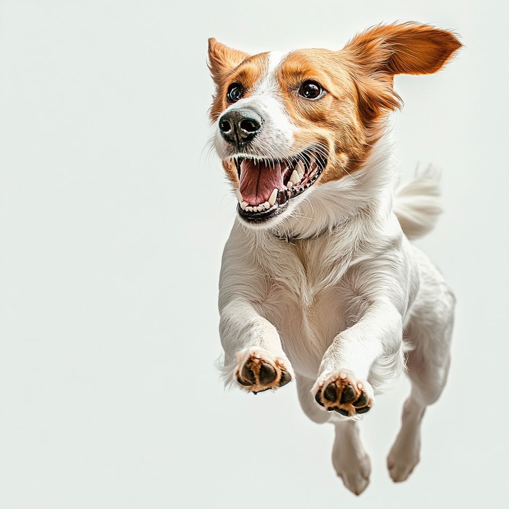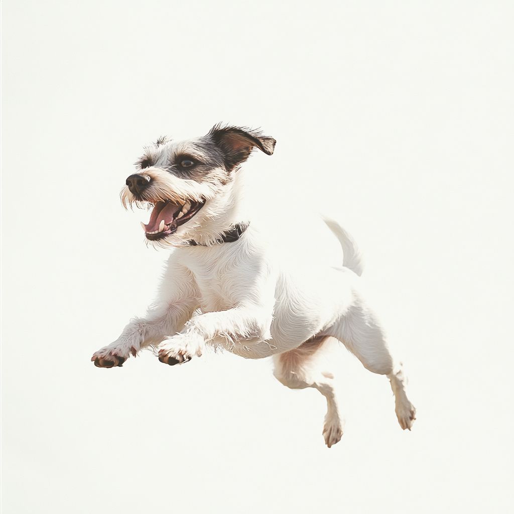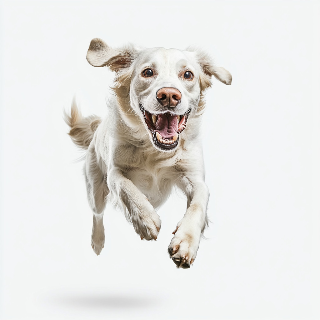 白色背景,极简风格,一只高贵的狗在充满活力地奔跑。