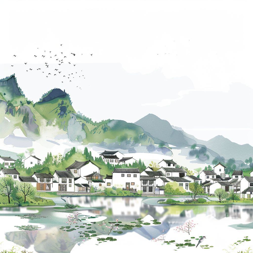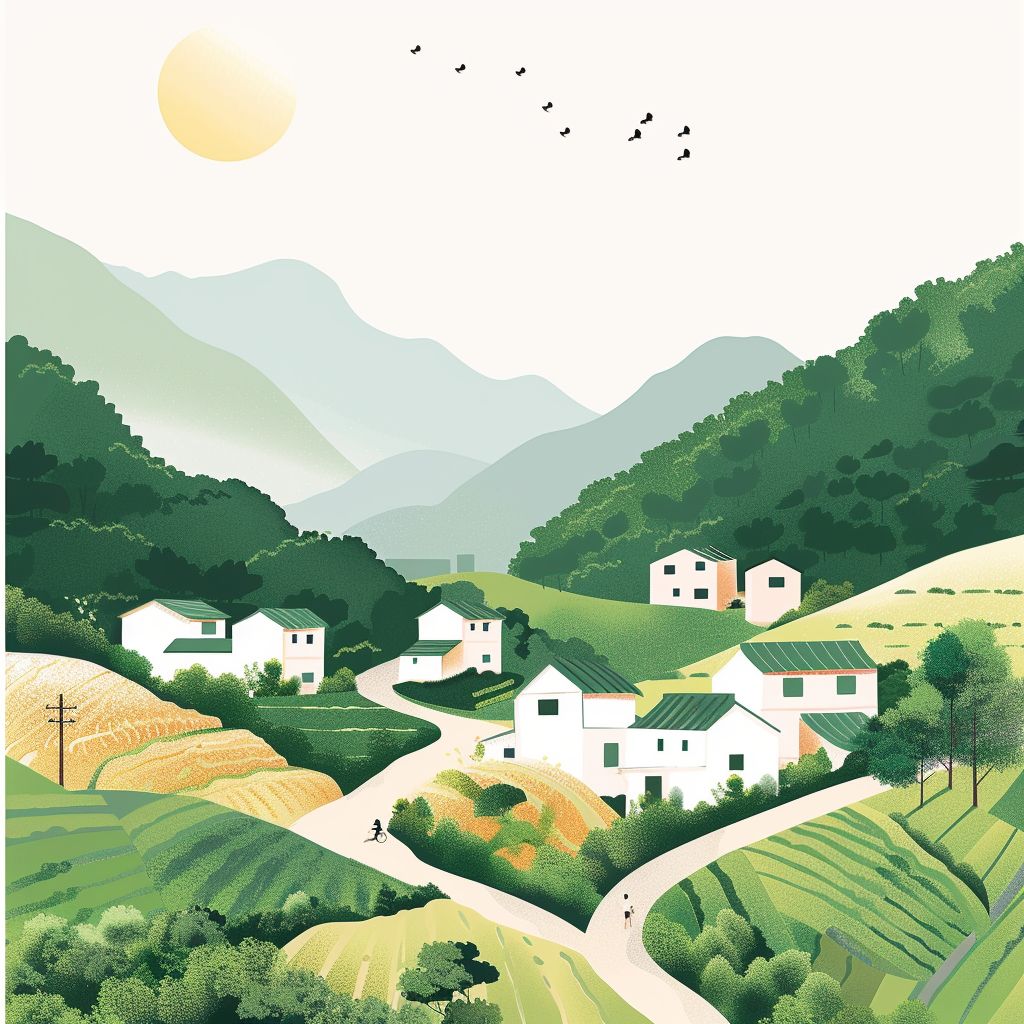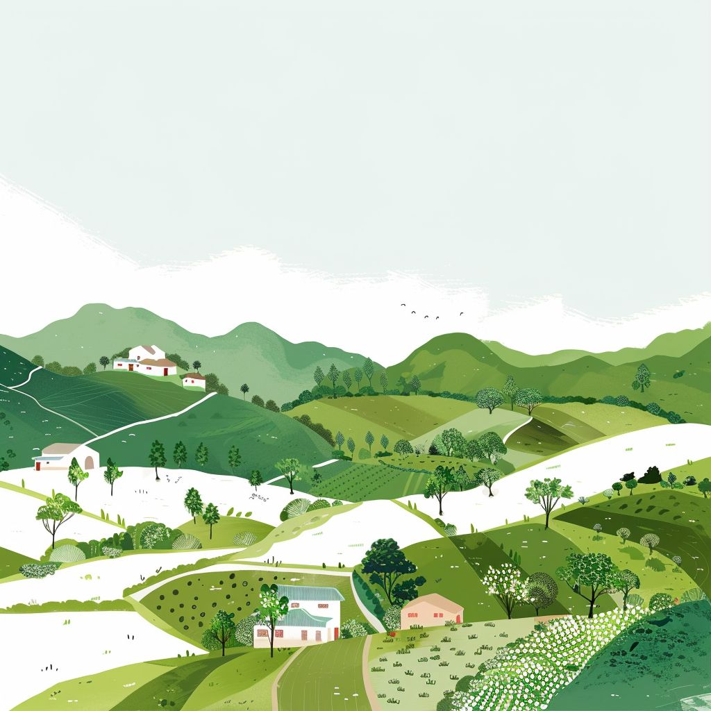 白色背景,极简风格,描绘了广东美丽乡村的生动场景和蓬勃发展的绿色美景。