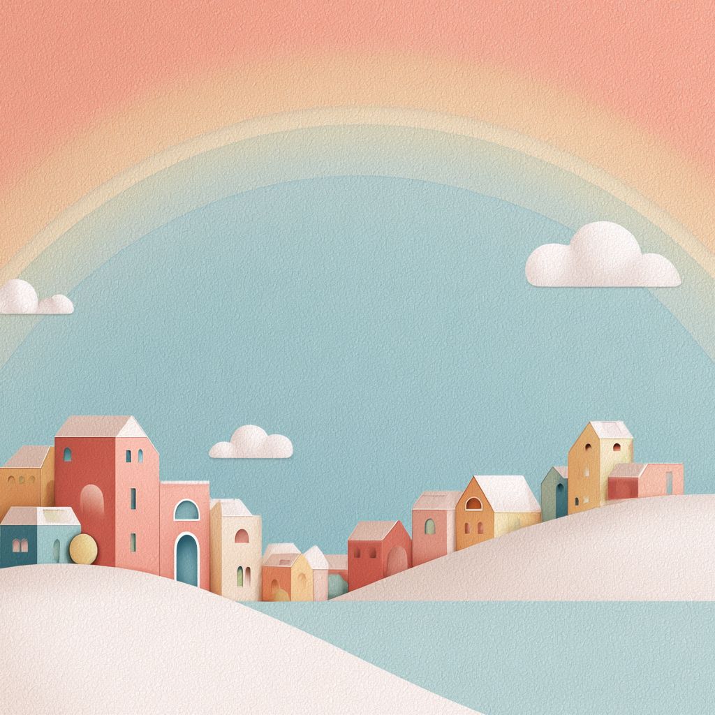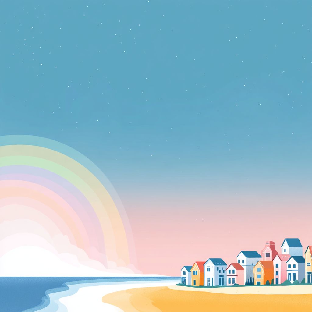 白色背景,极简风格,彩虹小镇的海滨。