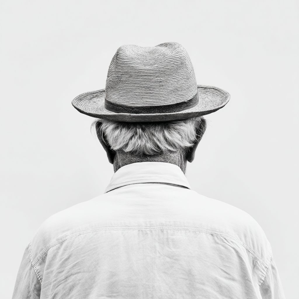 白色背景,极简风格,一位戴着帽子的老人。