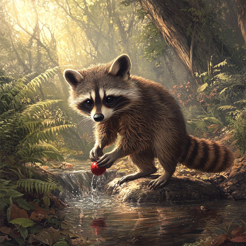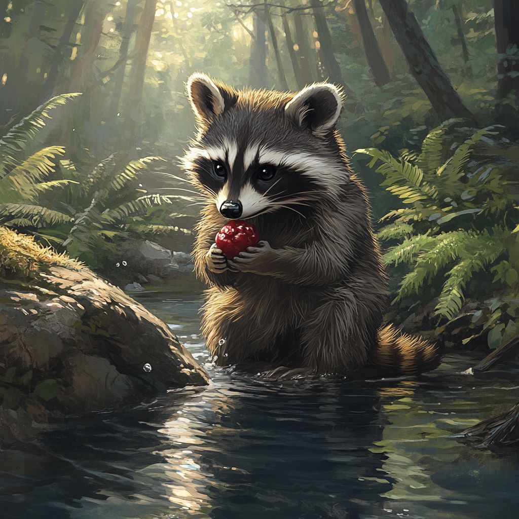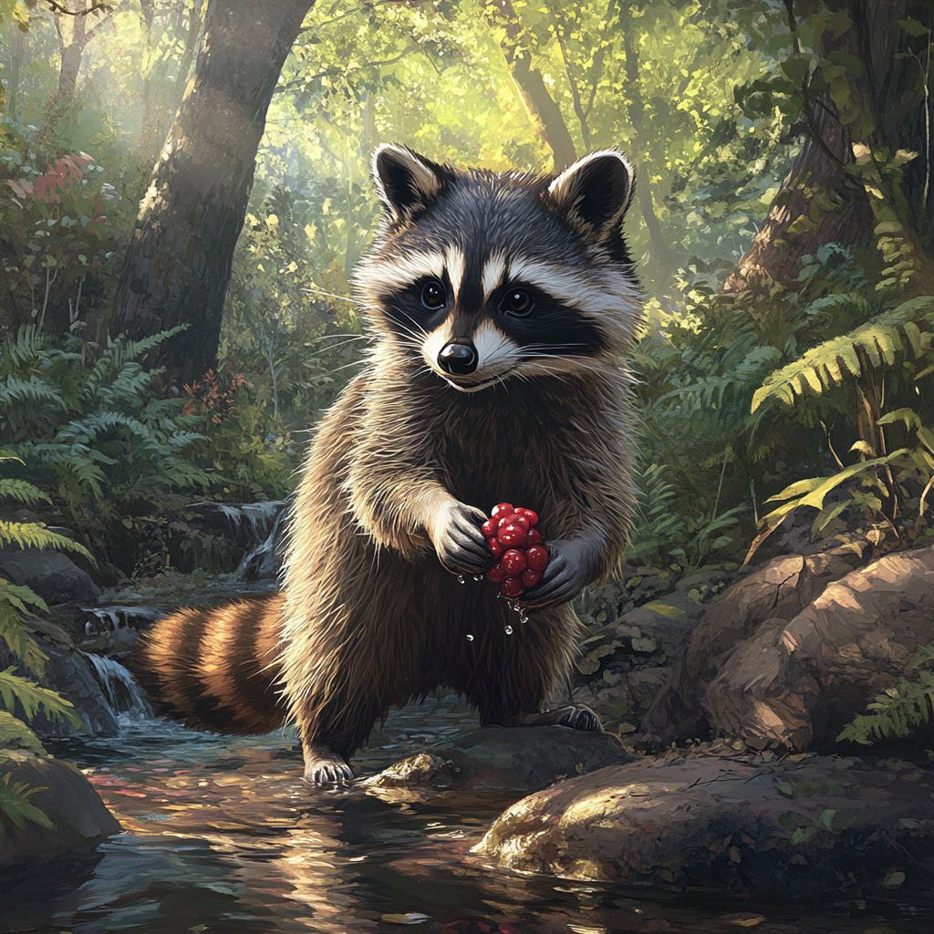 这是一幅现实主义风格的插图,描绘了一个森林场景。图像中央,有一只浣熊站在小溪边的一块岩石上,专心致志地洗着它前爪中握着的红色浆果。它蓬松的尾巴自然地垂挂着,背上的灰棕色毛发在阳光透过树叶间隙时轻轻闪烁。周围是绿色的蕨类植物和清澈的溪水,反射出浣熊的身影和河岸的景色。背景中,几棵高大的树木隐约可见,营造出一种宁静自然的整体氛围。