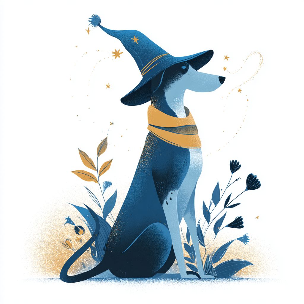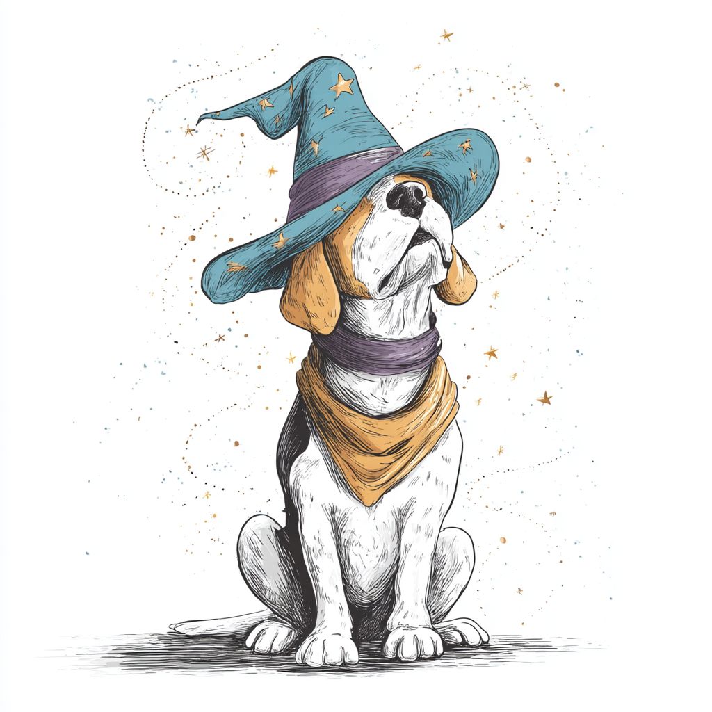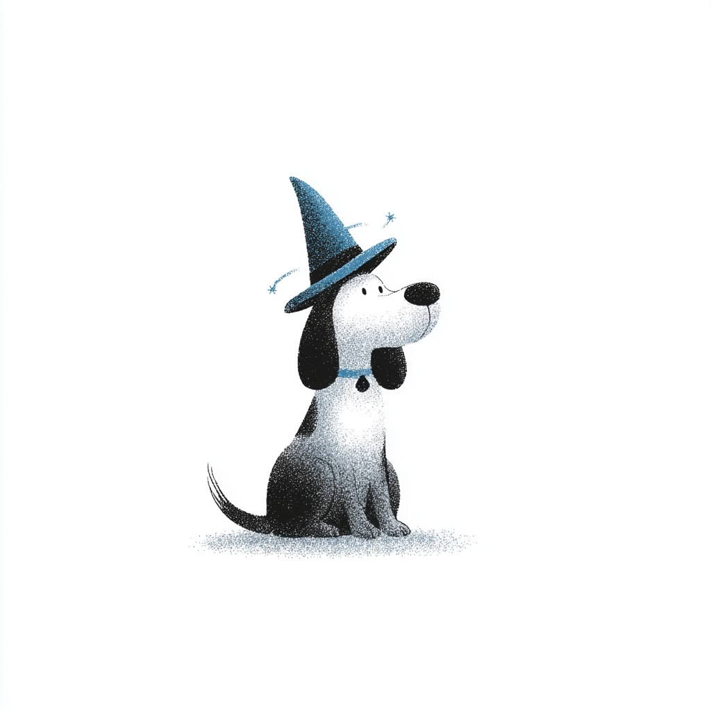 一只戴着魔法帽的狗在白色背景下施展魔法,采用极简风格。