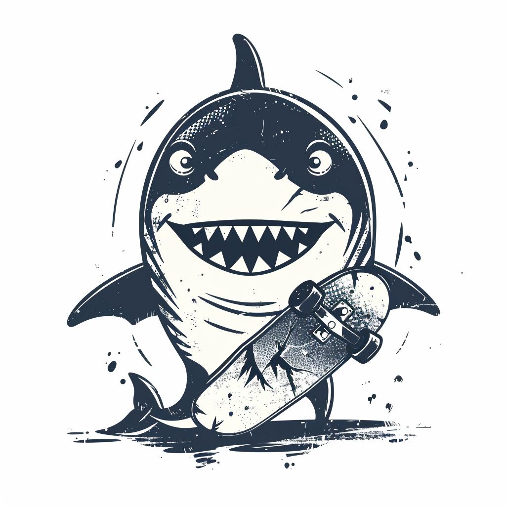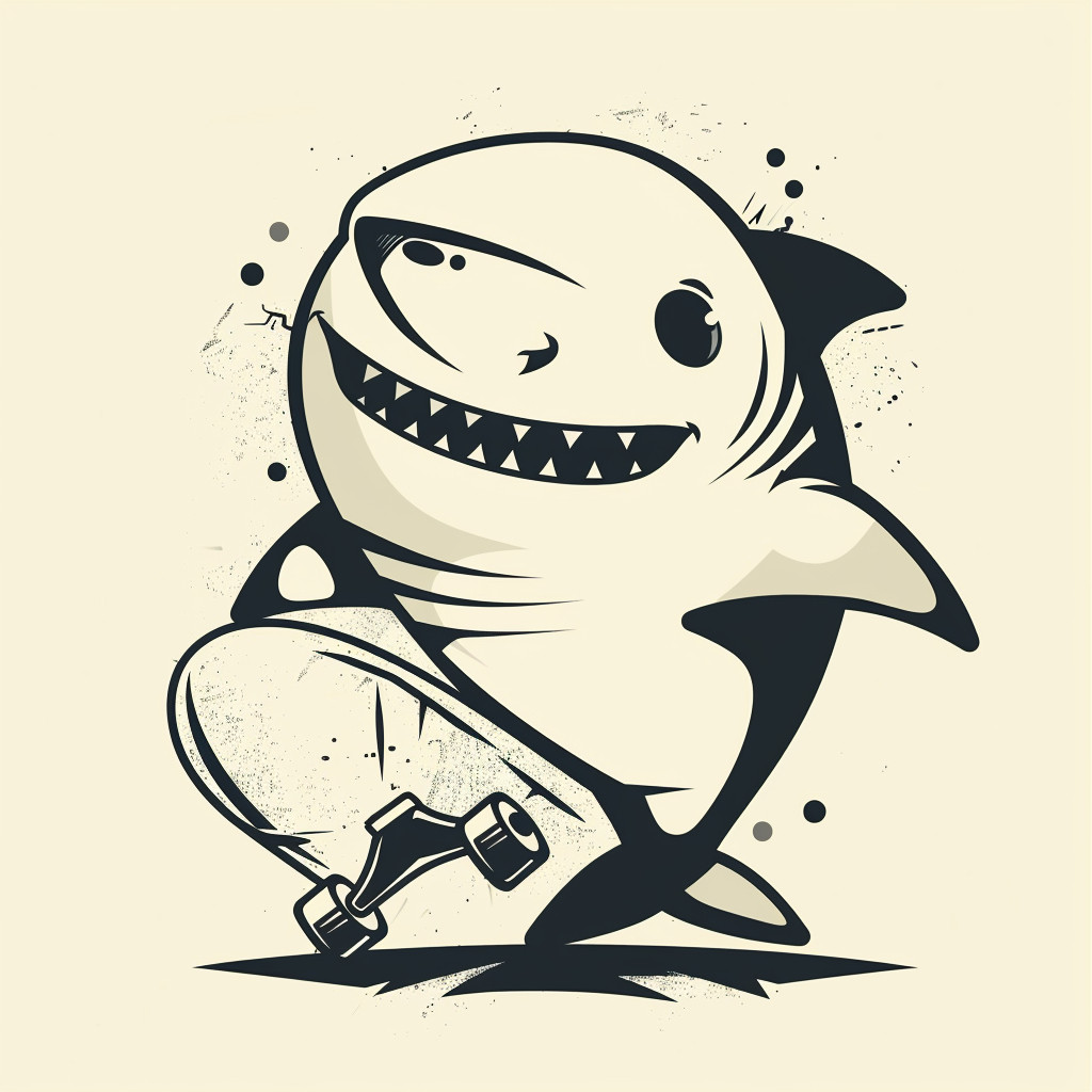 白色背景,极简风格,一个可爱的复古卡通鲨鱼吉祥物角色,设计风格为1950年代的丝网印刷,手里拿着一个破损的滑板。形状极其简化,比例可爱,厚重的轮廓,没有面部细节,仅用点和曲线表示,单色墨水设计。风格让人想起旧美国餐厅的标志。非常适合复古T恤印刷。米白色背景。