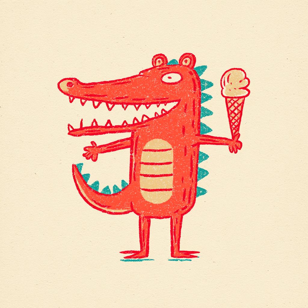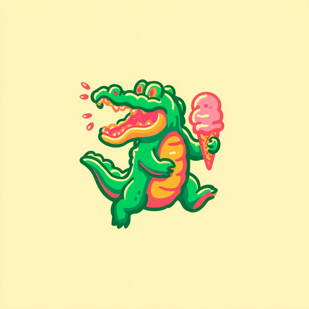 色彩丰富的可爱复古卡通吉祥物角色鳄鱼,采用1950年代丝网印刷风格,手拿融化的冰淇淋锥形。形状极其简化,类似于迷你版比例,厚实的轮廓,没有超出点和曲线的面部细节,单色墨水设计。仿佛是1950年代漫画书封面的风格。非常适合复古T恤印刷。米白色背景。
