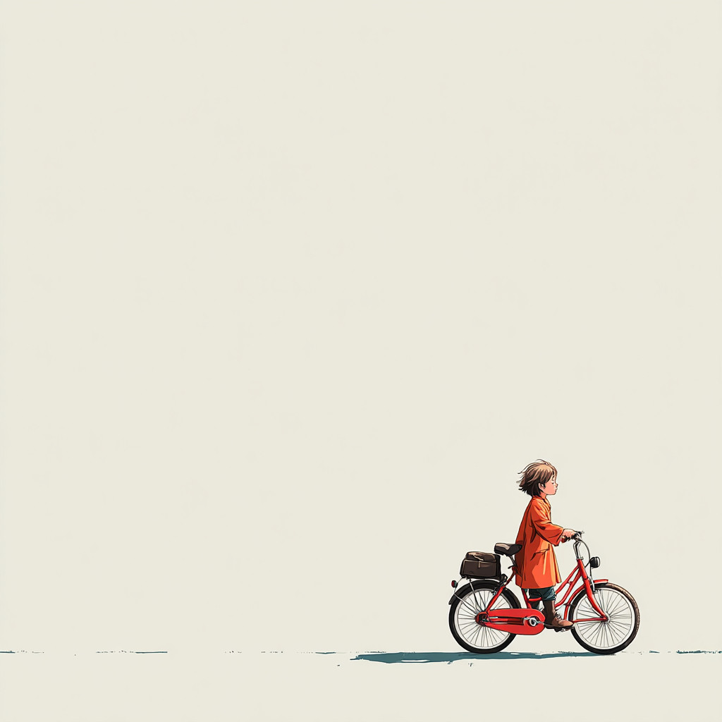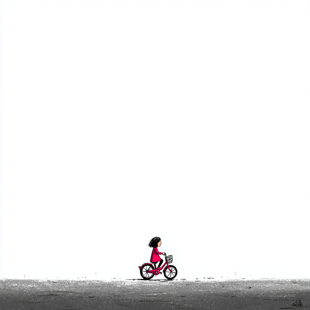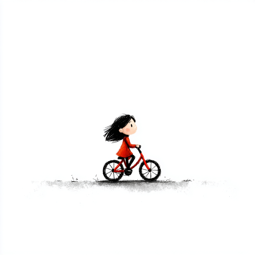 白色背景,极简风格,一个小女孩骑着自行车。