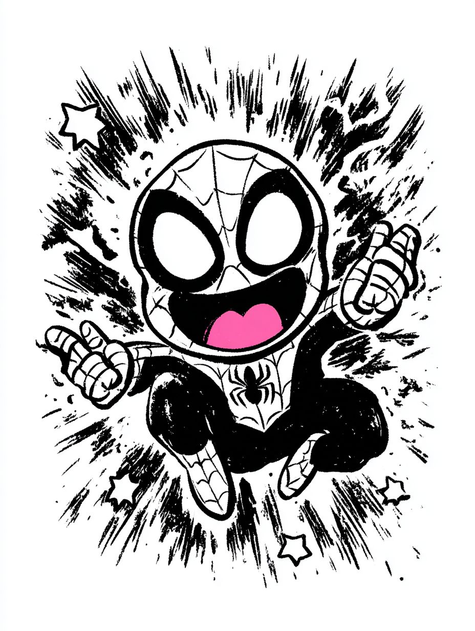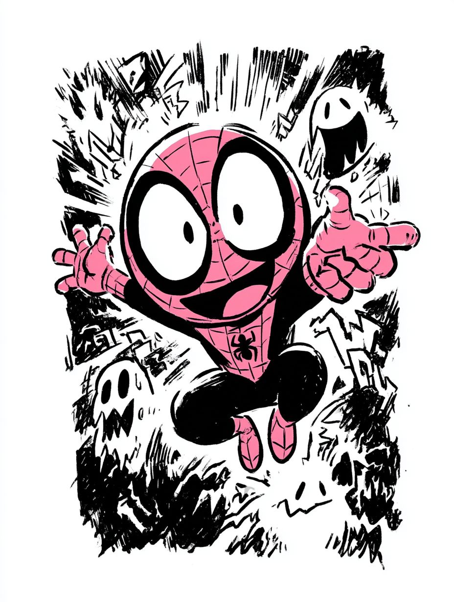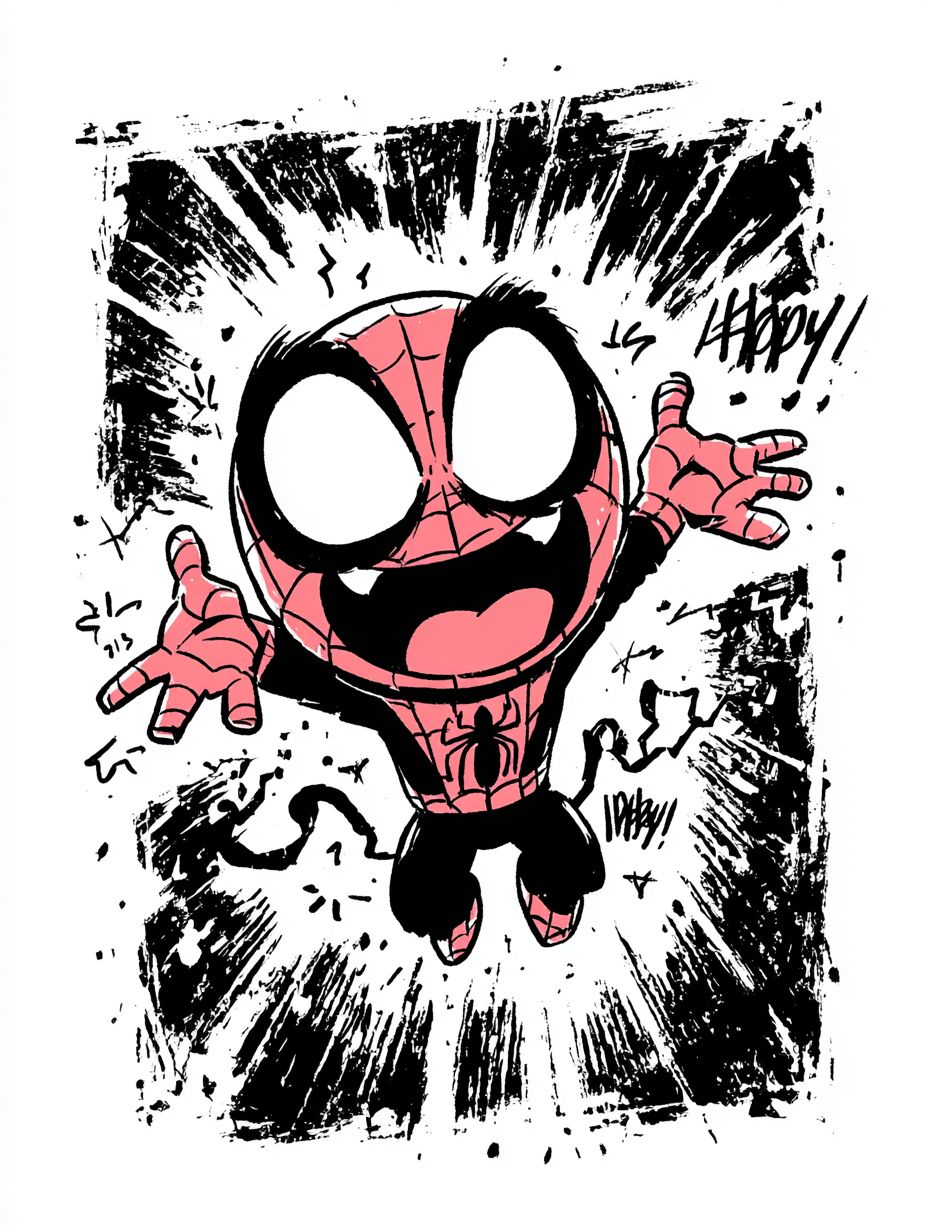 卡通风格的蜘蛛侠,飞行中,傻傻的快乐表情,Q版风格,超可爱,夸张搞笑,干净的背景