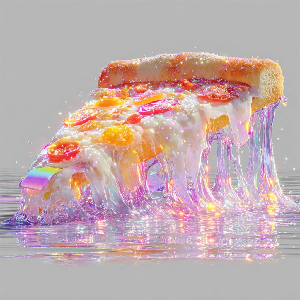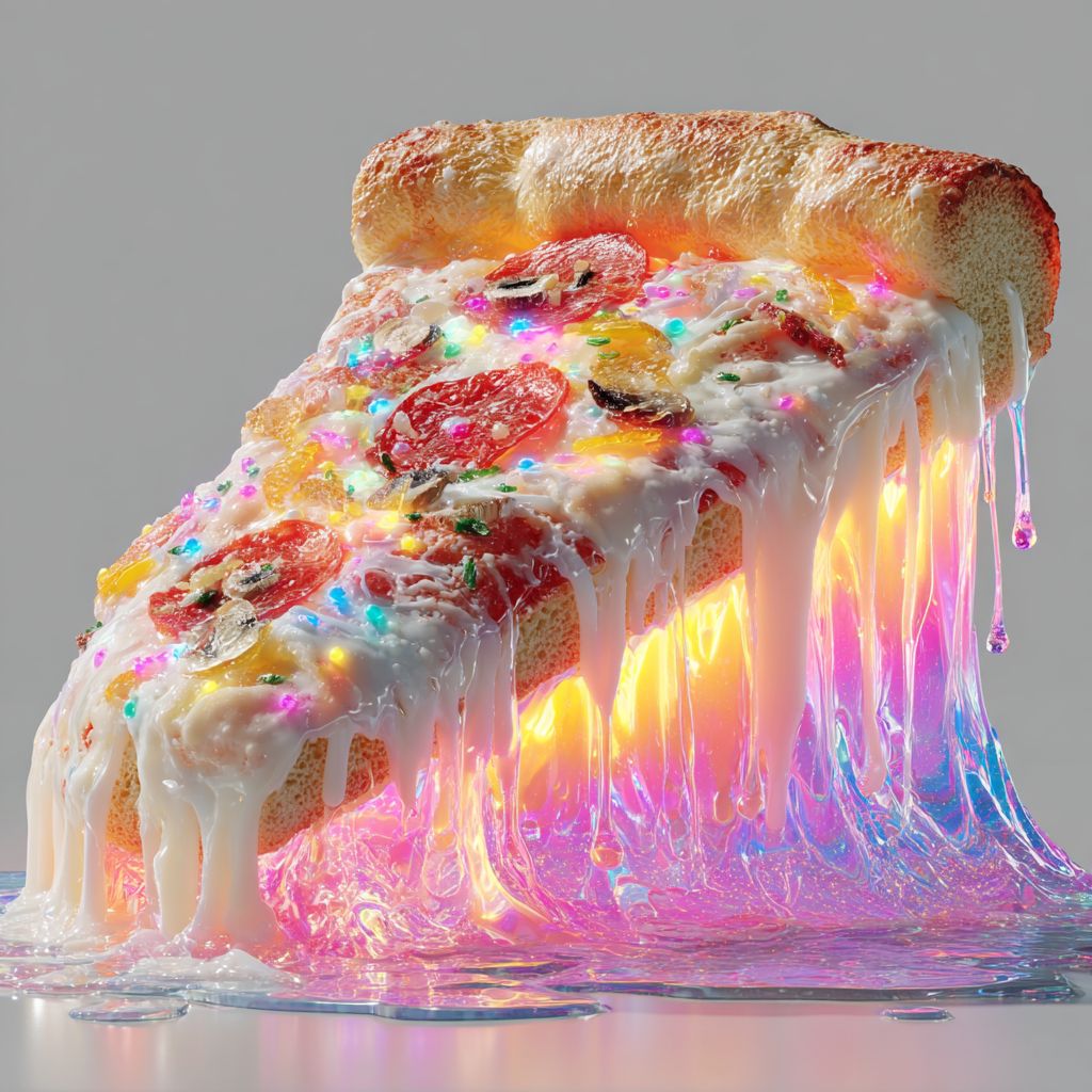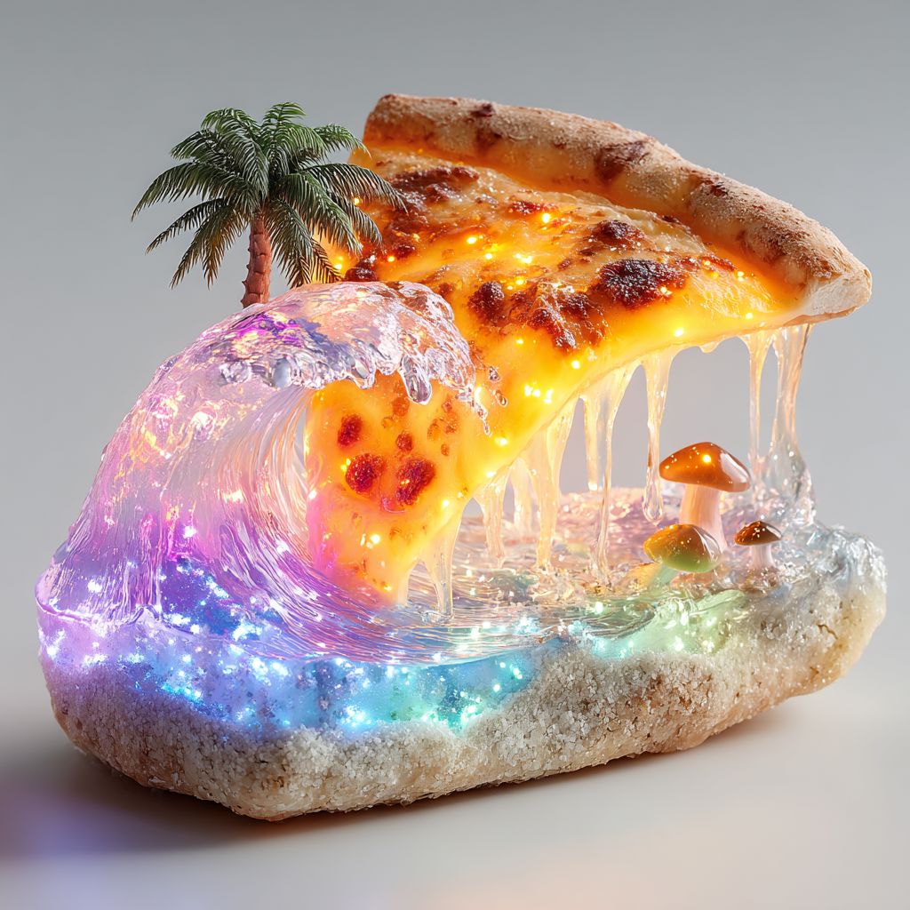 一片超现实的披萨在熔化的奶酪和霓虹配料的波浪上冲浪,白色背景