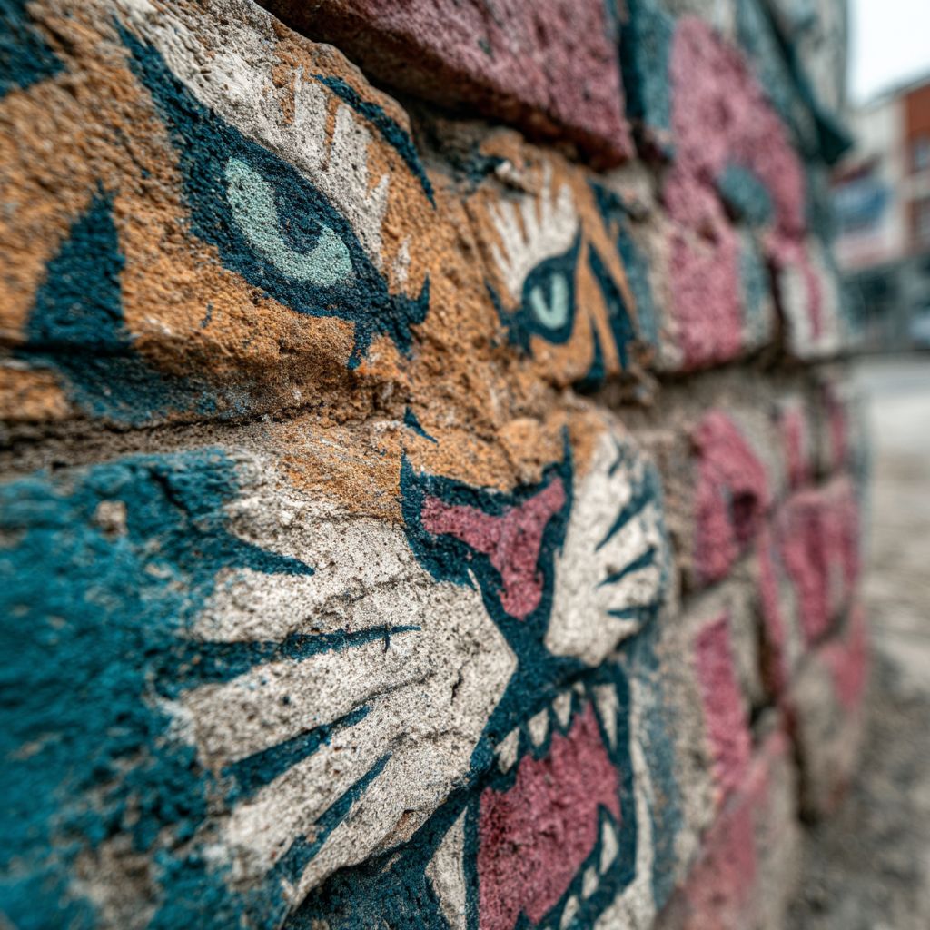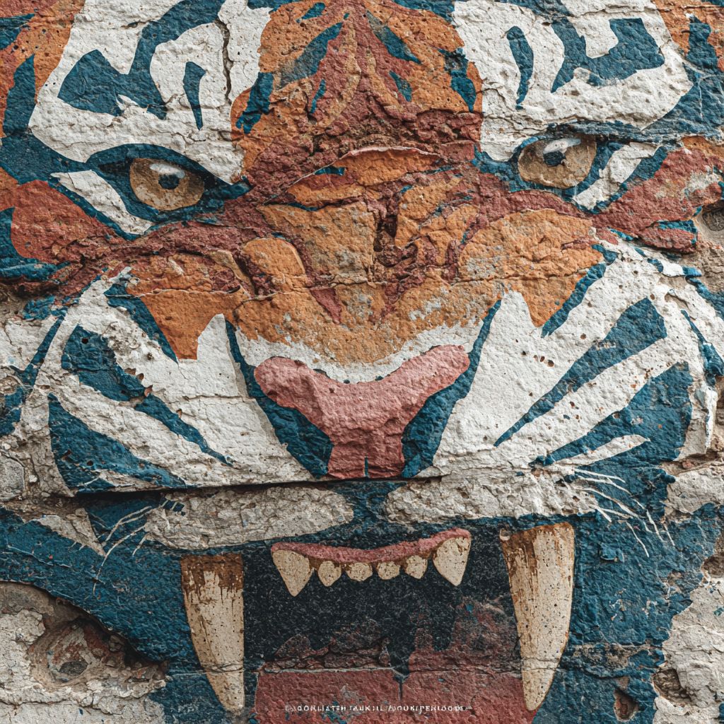 一面粗糙的城市墙上,有多层涂鸦标签形成一个凶猛的老虎脸,白色背景