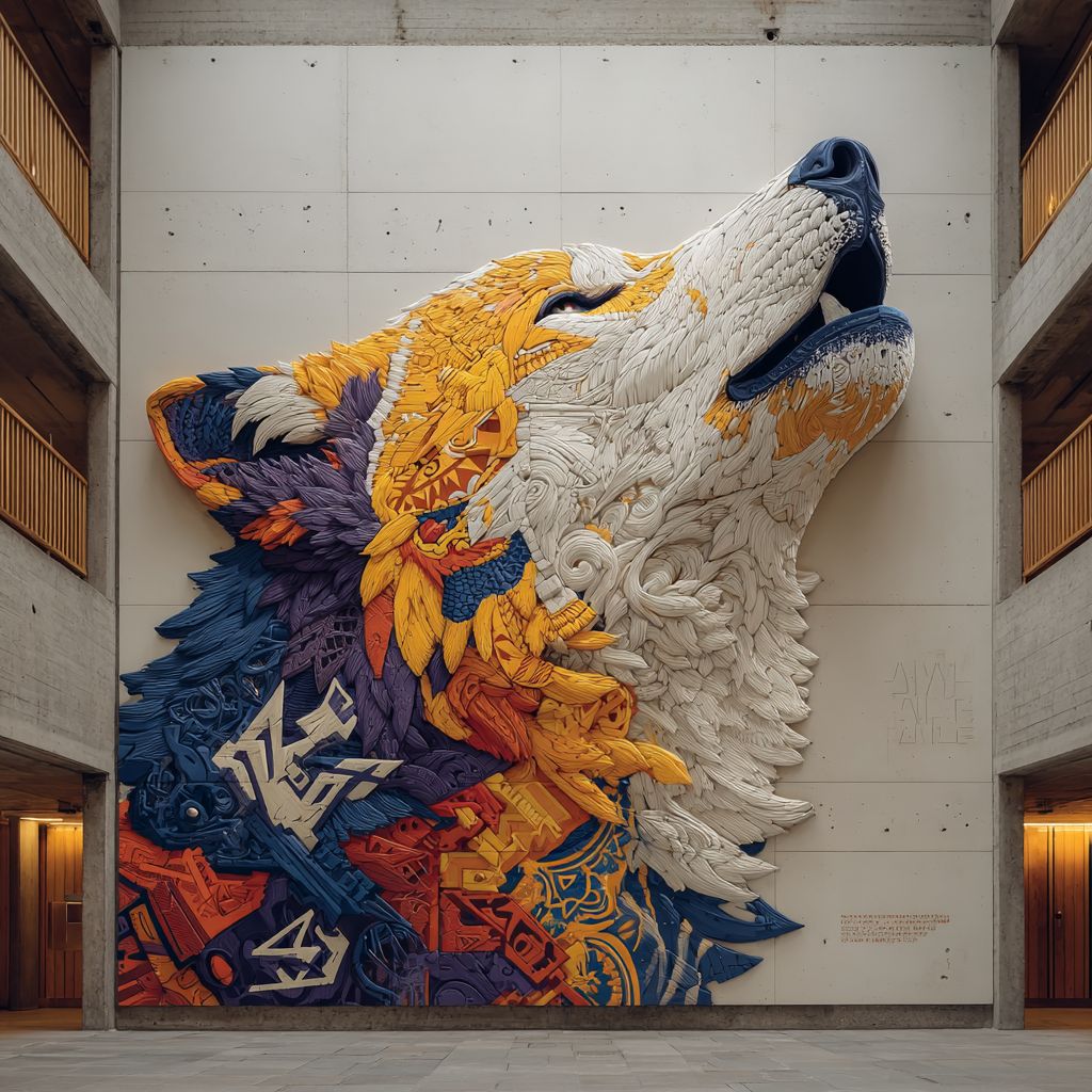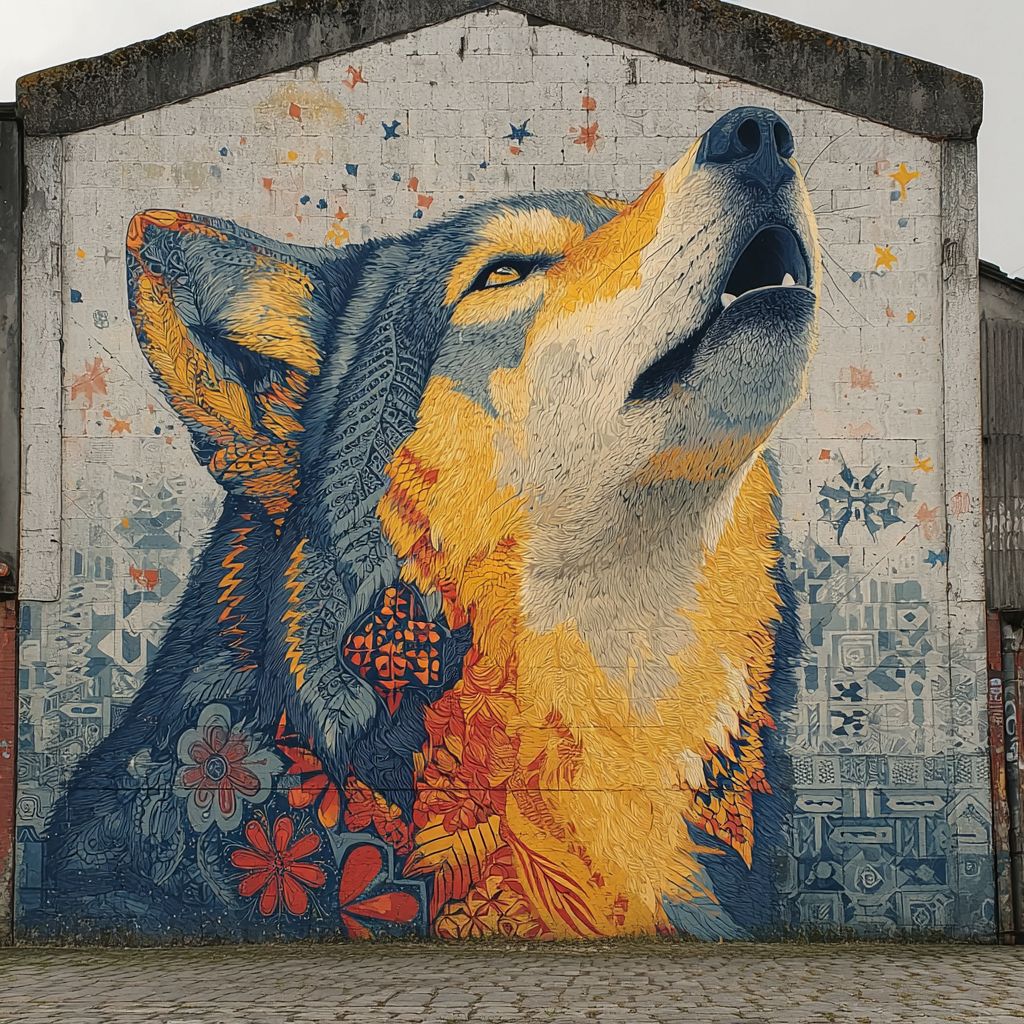一幅生动的壁画,描绘了一只在电光涂鸦图案中嚎叫的狼,背景为白色