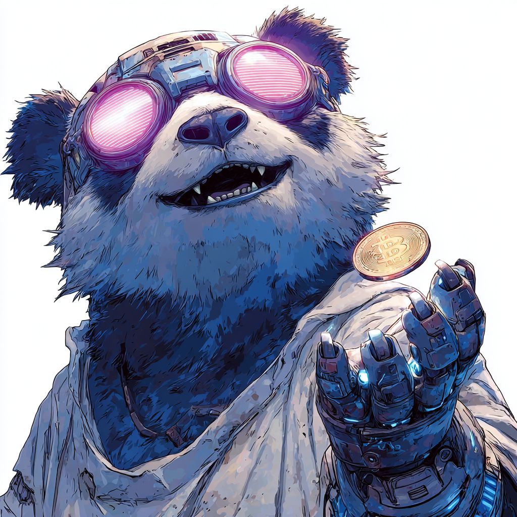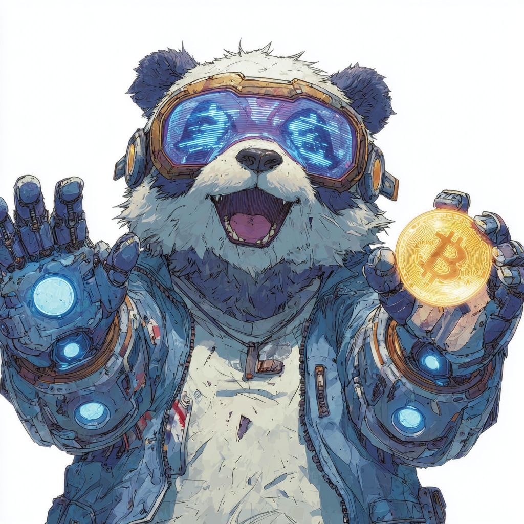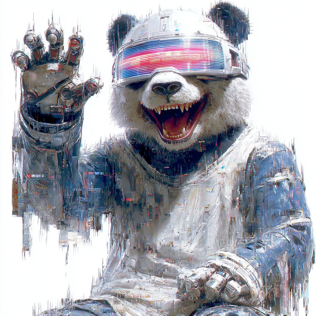 微笑的熊猫戴着故障的赛博朋克护目镜,正在翻转一个全息硬币,白色背景