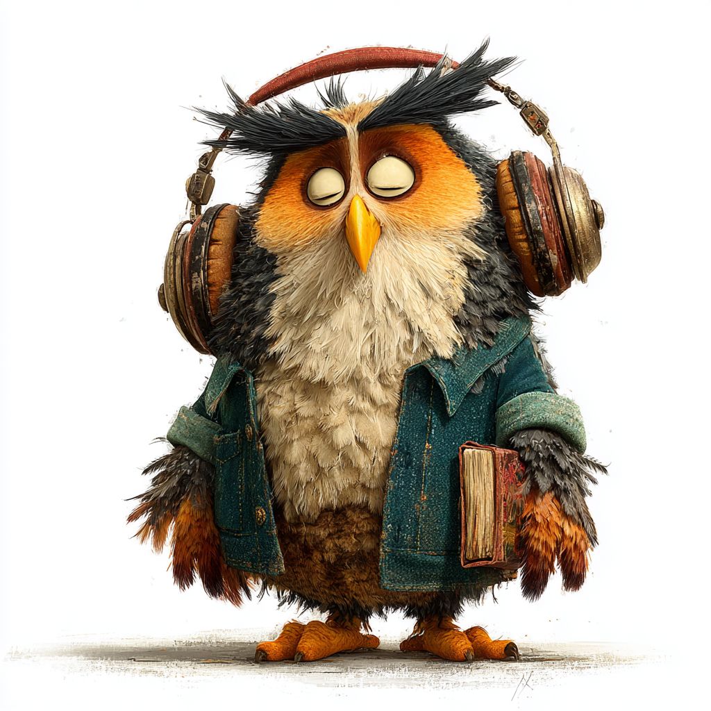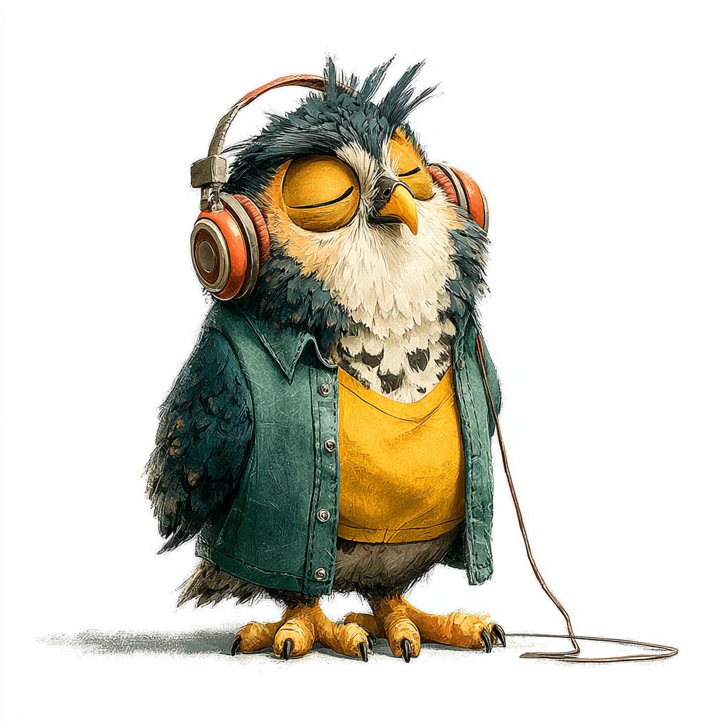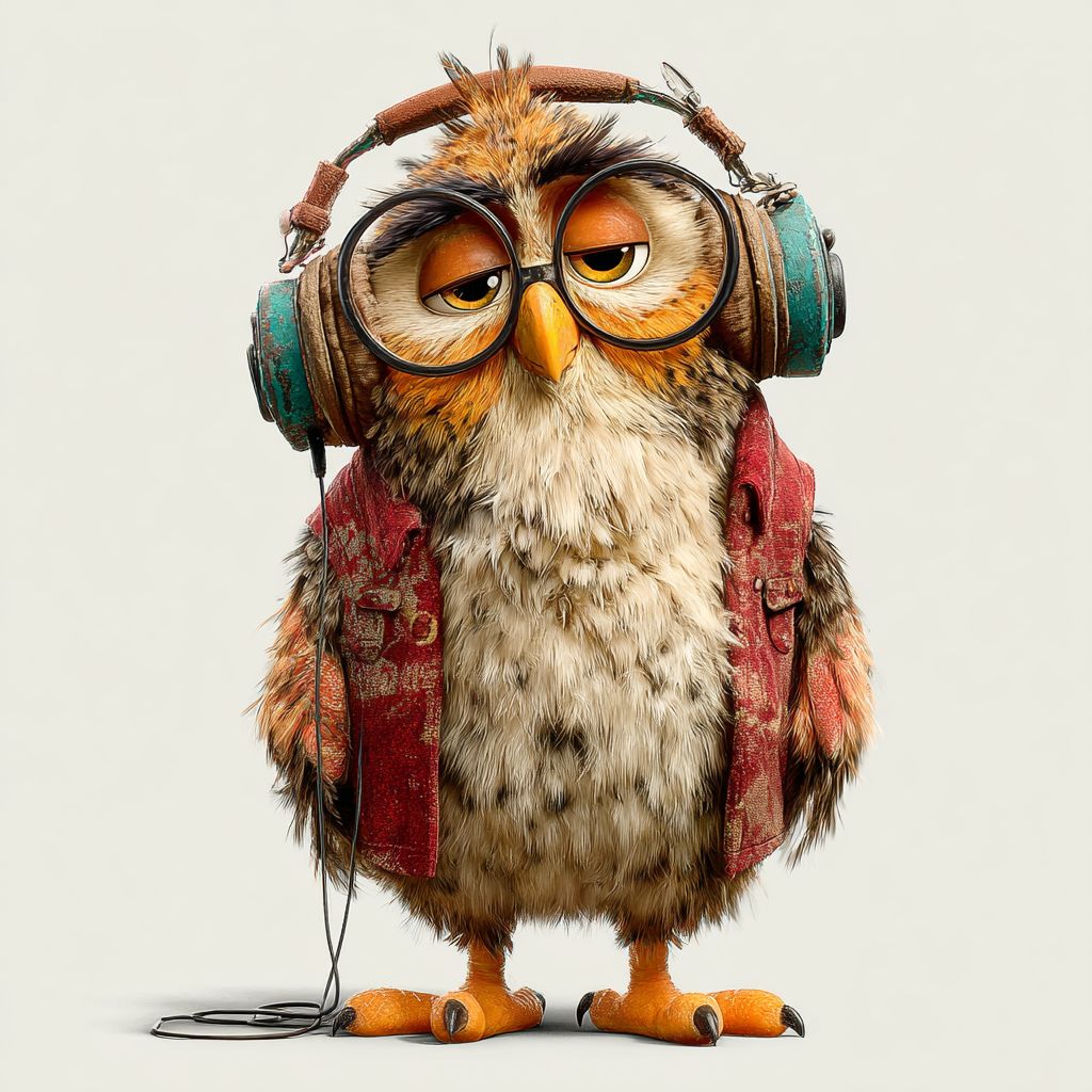 一个戴着耳机、随着音乐摇摆的古怪卡通猫头鹰,背景是白色的。