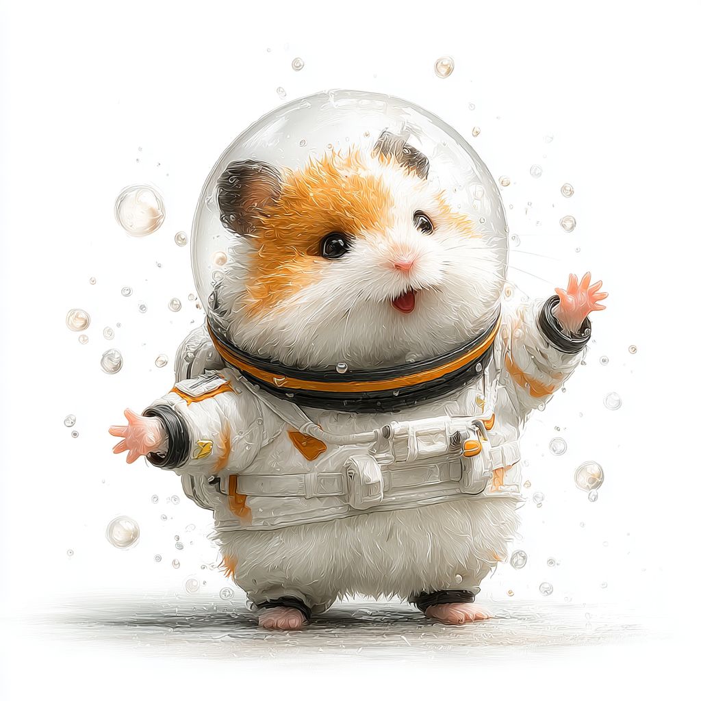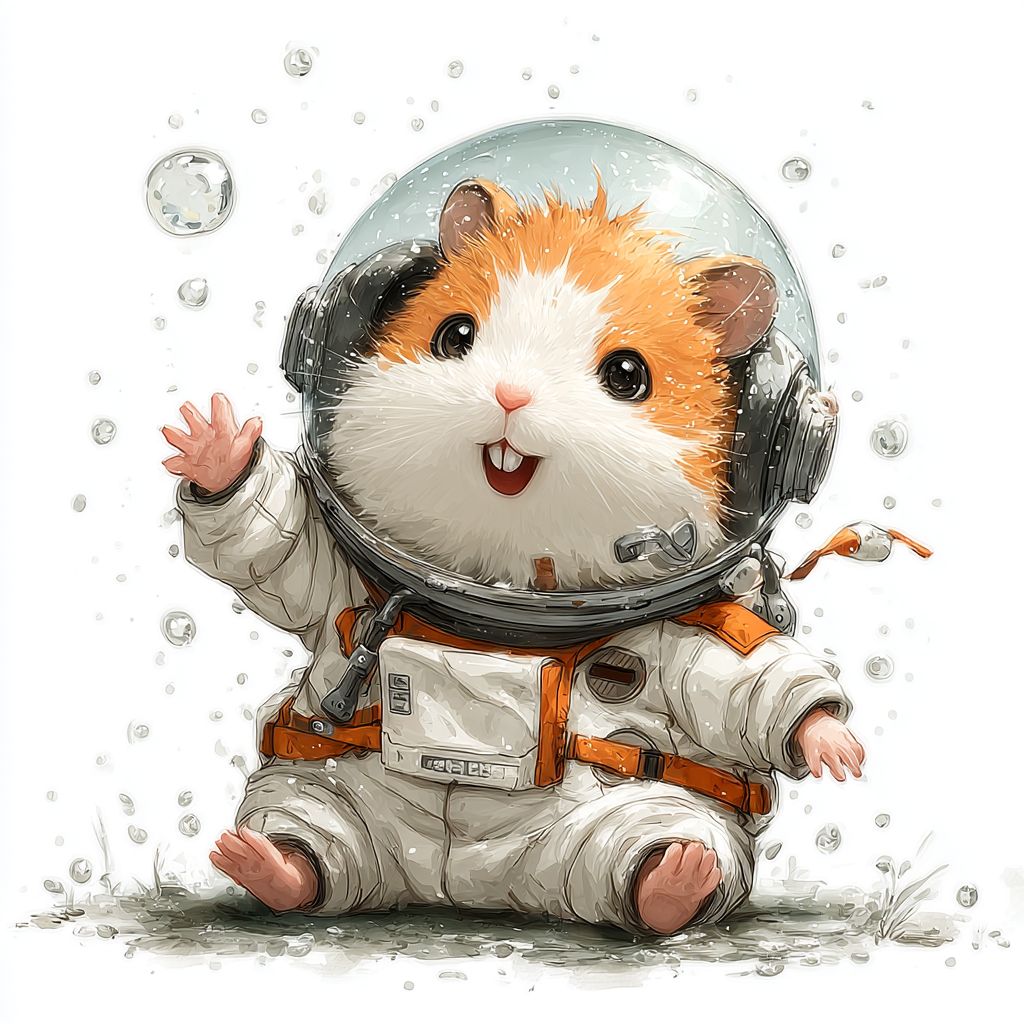 一只穿着小宇航员头盔的活泼卡通仓鼠,挥手,白色背景